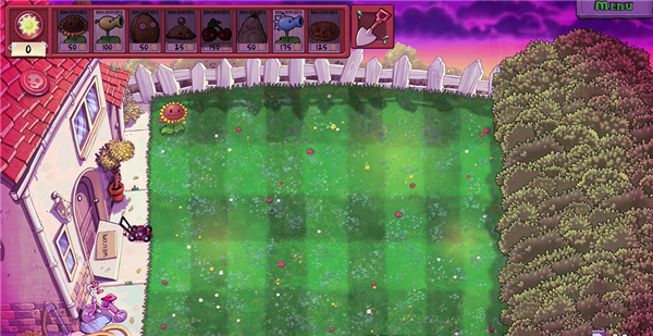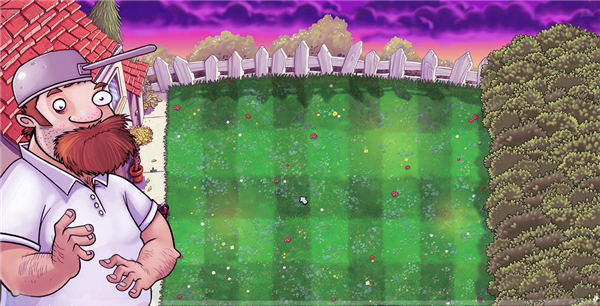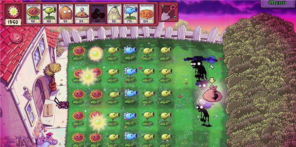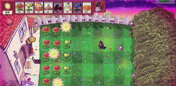 《植物大战僵尸》的夜晚花园防御战。向日葵、豌豆射手和蘑菇能抵御住宅附近靠近的僵尸。2-4级,拥有586点阳光点数。